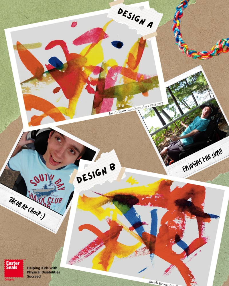 These postcards were created by Soul’s brother Jacob, who lived with complex cerebral palsy. Jacob loved spending his summers at Easter Seals camp and created these watercolour paintings while at camp. Because of his disability, he had difficulty with motor skills, so to create these paintings, Jacob was given paint brushes while camp councillors made him laugh. With his laughter, his arms would swing over the canvas, creating artwork that is imbued with his infectious joy and smiles.